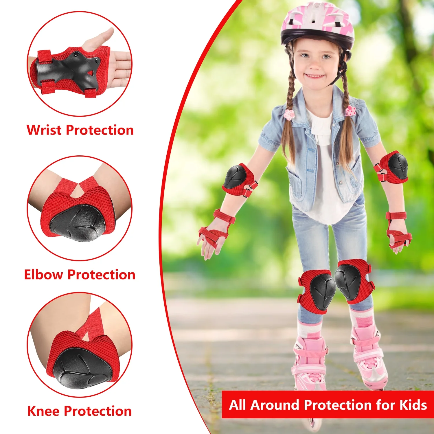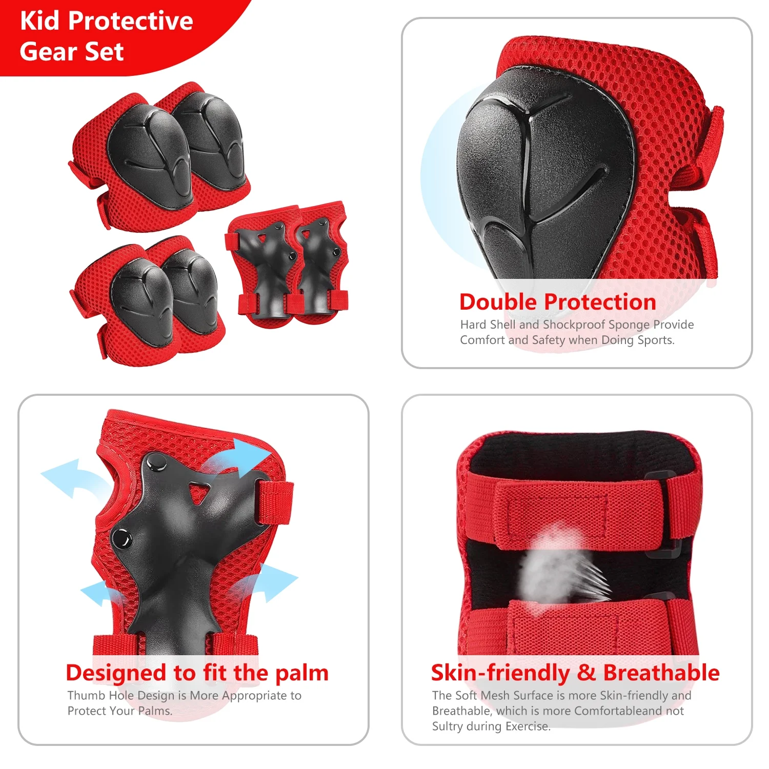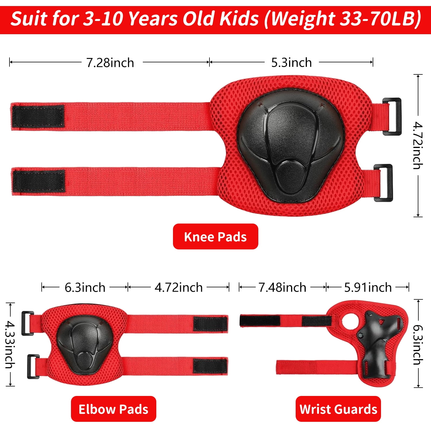 Features: 3 in 1 Protective Gear Set: Includes knee pads, elbow pads, and wrist guards for complete safety during sports. Thicken Double-Layer Padding: Effectively reduces impact and provides superior protection for knees, elbows, and wrists. Adjustable & Secure Fit: Upgraded elastic straps and strong Velcro ensure a comfortable and snug fit for kids aged 2-8. Breathable & Comfortable: Soft foam and cotton lining wick away sweat, keeping skin cool and refreshed even during intense activities. Curved Design: Transfers impact and minimizes injuries from falls, offering enhanced protection for roller skating, skateboarding, cycling, and more. Durable & Sturdy: Made from high-quality PVC and EVA materials, built to withstand outdoor sports and extreme activities. Perfect for Beginners: Enlarged elbow pads and wrist guards are ideal for kids learning skateboarding, rollerblading, or cycling. Versatile Use: Suitable for skateboarding, roller skating, skiing, biking, scooters, running, and other outdoor sports. Ideal Gift: A great present for Children’s Day, birthdays, Christmas, or any occasion for youth boys and girls. Upgraded Version 3.0: Improved design for better protection and comfort, making it a must-have for active kids. Package Includes: 2 x Elbow Pad, 2 x Knee Pad, 2 x Wrist Guard Frequently Asked Questions: Q: Is this size fit for my 15-year-old and 10-year-old girl? A: It’s a “small” size and suitable for 2-10 years old with a body weight between 33-70 pounds (Depending on the child’s height). Q: How can I safely wash these? A: No in the machine; Just hands and brush. Q: Would these be good for snowboarding or biking? A: Yes, I believe so, nice hard protective covers. Q: Is this a pair of each item? A: Yes