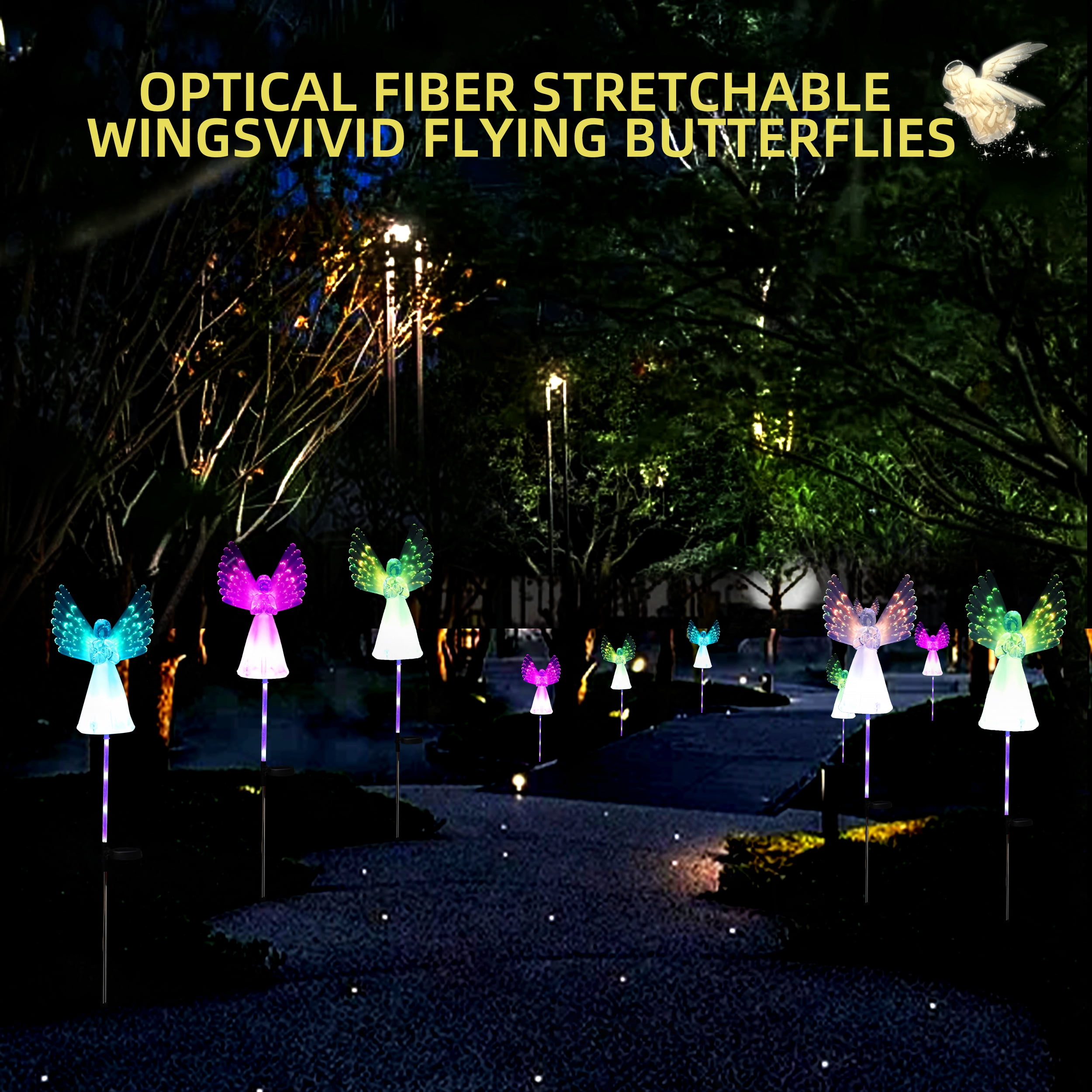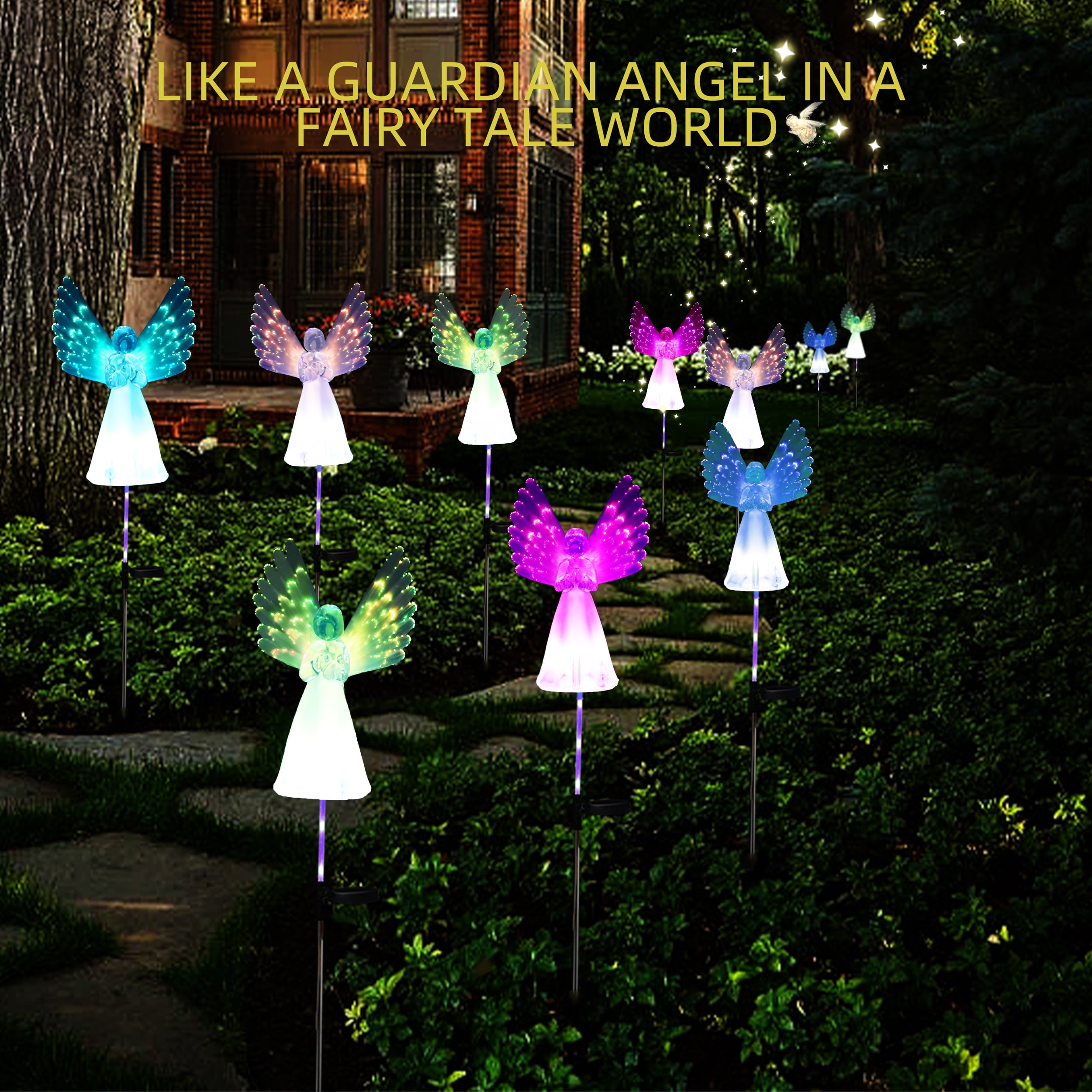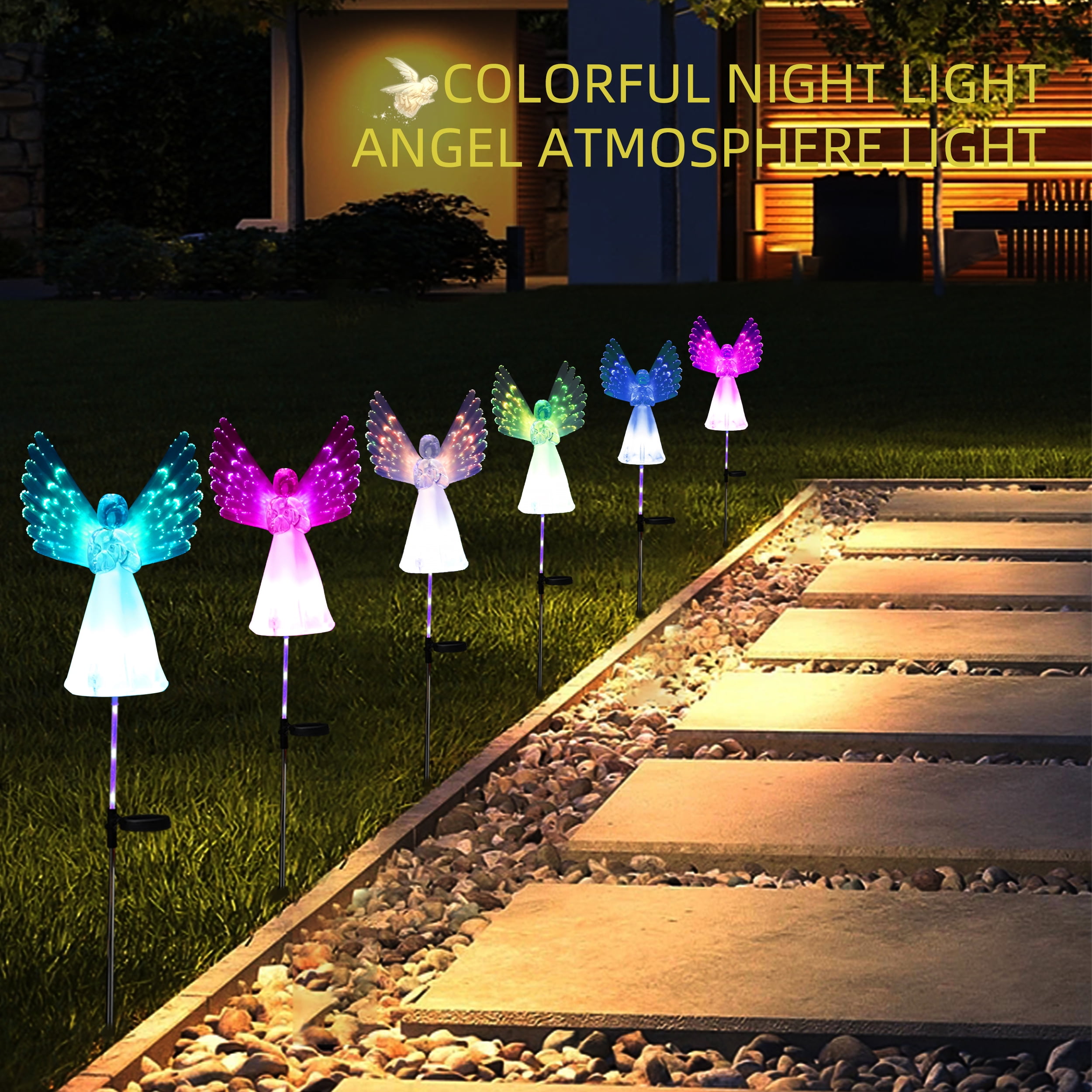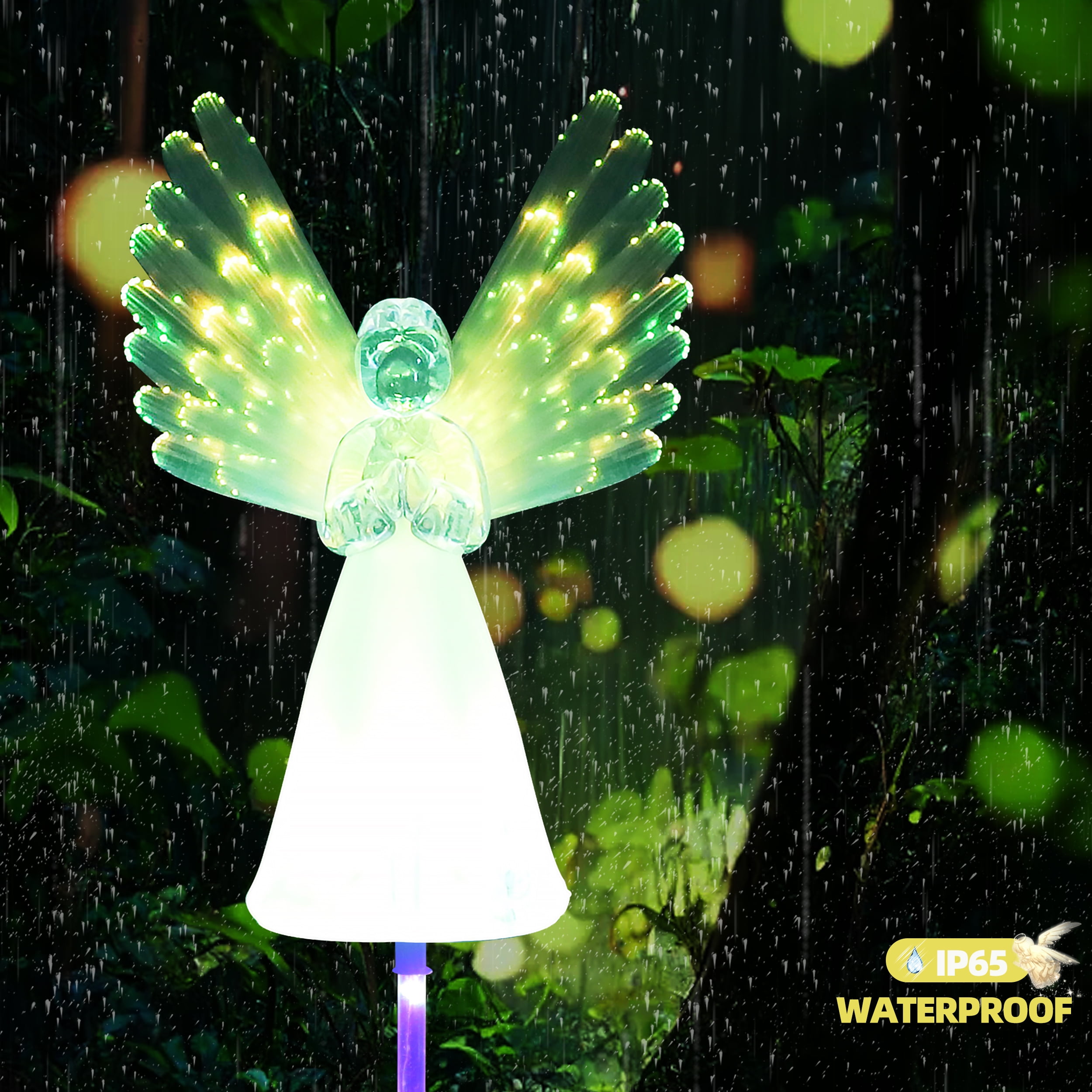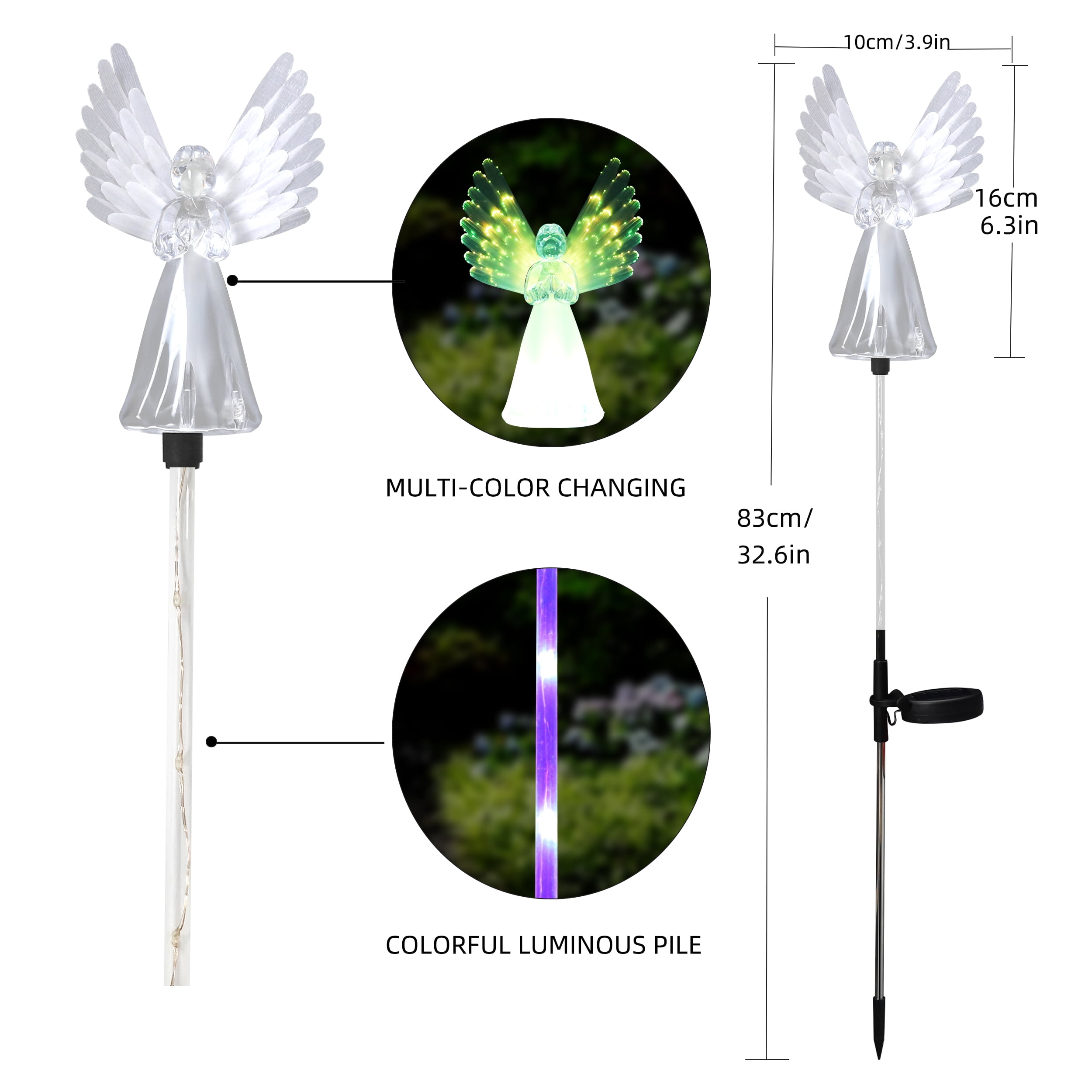 Features 🌈 Multi-Color Changing – Automatically cycles through beautiful colors for enchanting nighttime displays ☀️ Solar Powered – Eco-friendly energy solution with automatic dusk-to-dawn operation 👼 Angel Design – Symbolizes hope, comfort and remembrance, perfect memorial decoration ⚡ Easy Installation – No wiring needed, simply stake into ground and turn on 🎁 Versatile Use – Ideal for graves, gardens, pathways, patios and holiday decorations Specifications 🔋 Power Source: Solar energy (built-in rechargeable battery) 💡 Light Duration: 6-8 hours when fully charged 🛡️ Material: Weather-resistant silicone and durable plastic 📦 Package Includes: 2 solar angel lights with stakes 🌧️ Weatherproof: Suitable for outdoor use in various conditions Notice ⚠️ For best performance, keep solar panel clean and free from obstructions ⚠️ Ensure switch is set to “ON” position for automatic operation ⚠️ Place in direct sunlight for optimal charging (6-8 hours recommended) ⚠️ Push stakes completely into ground for stability during windy conditions ⚠️ Cover solar panel to test automatic lighting function