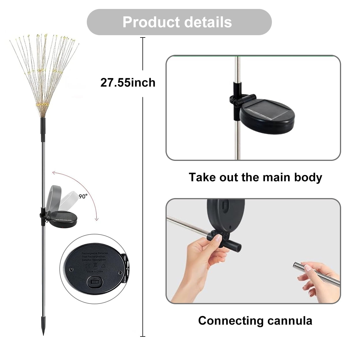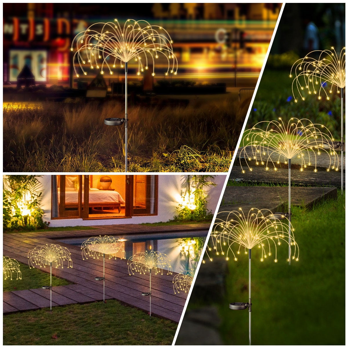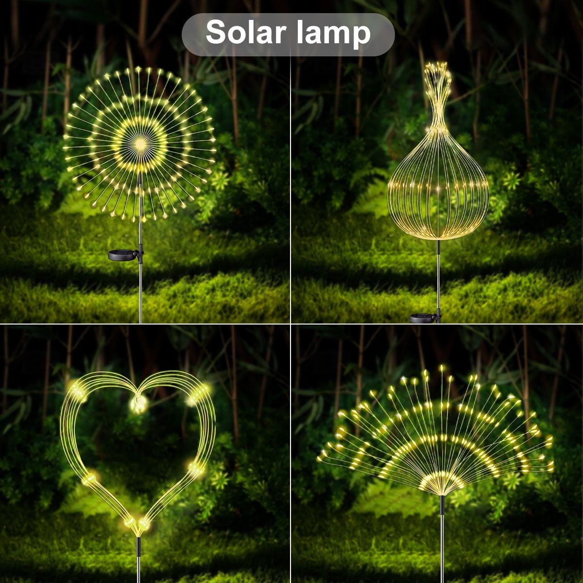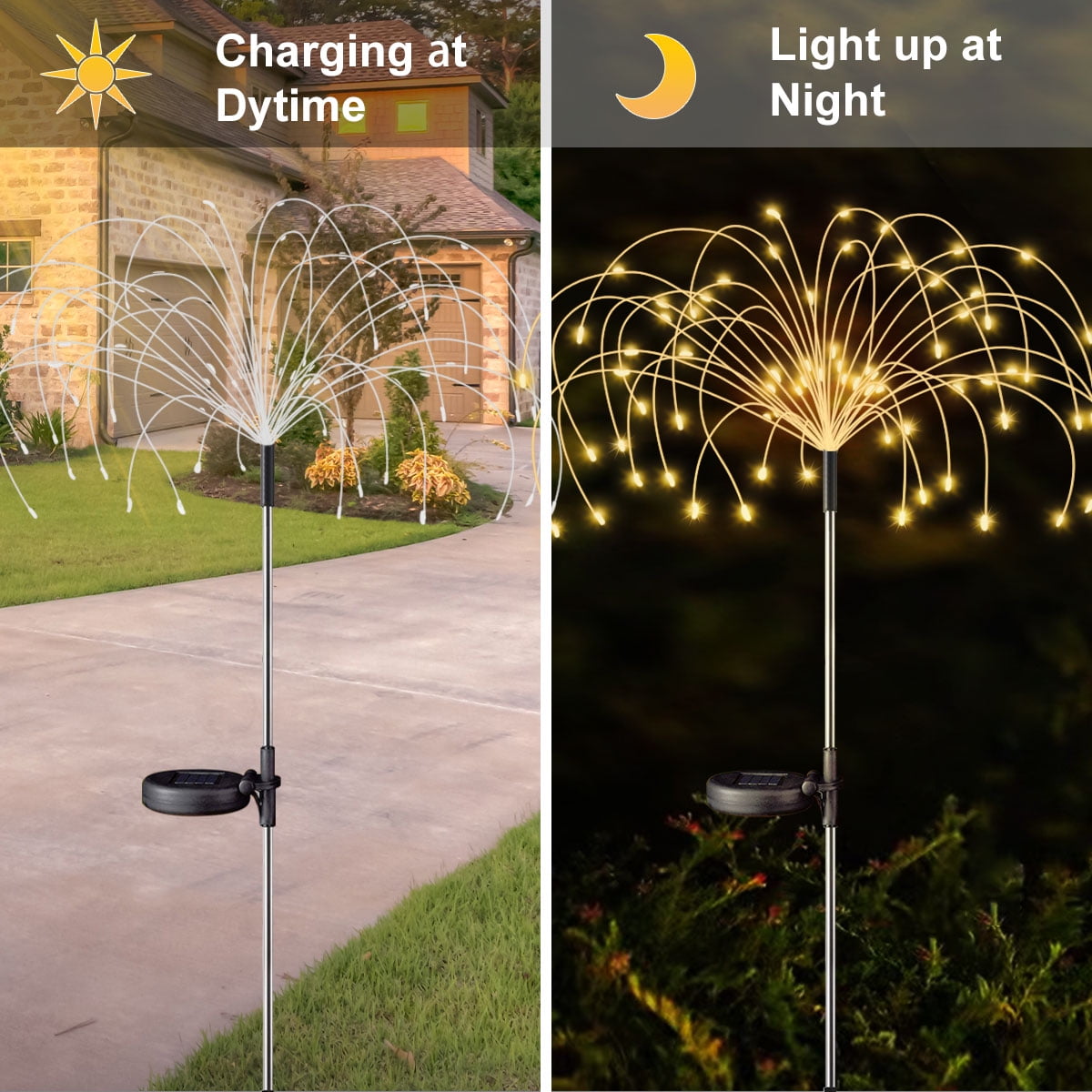 Rirool 2 Pack Solar Garden Lights, 120 LED Firework Lights ✨ 120 LED Multicolor Solar Lights: Create vibrant, lifelike firework displays with 120 bright LED beads, powered entirely by solar energy./li> 🌞 Efficient Solar Charging: Equipped with a high-efficiency monocrystalline solar panel, charging in 6-8 hours under sunlight for up to 12 hours of illumination. 🎨 Flexible DIY Design: Bendable copper wire allows you to shape the lights into fireworks, flowers, hearts, spirals, or any creative design. 🌧️ IP65 Waterproof Rating: Built to withstand rain, snow, and extreme weather, ensuring durability for year-round outdoor use. 🔋 Long-Lasting Ni-MH Battery: Features a 1200mAh rechargeable battery for extended nighttime lighting. 🌙 Auto On/Off Function: Automatically turns on at dusk and off at dawn, saving energy and hassle-free operation. 🔧 Easy Installation: No wiring or cables needed—simply plant the stakes, turn on the switch, and enjoy instant ambiance. 🎉 Versatile Use: Perfect for gardens, pathways, patios, parties, weddings, and festive decorations like Christmas. 💡 Energy-Efficient & Eco-Friendly: Harnesses solar power to reduce electricity costs and environmental impact. 💯 100% Satisfaction Guarantee: Contact us within 24 hours for any issues—we’re here to help! 🔋 Solar Panel Specifications: Solar Panel Type: Monocrystalline Solar Panel Voltage: 2V Charging Time: 6-8 hours (under direct sunlight) Battery Type: High-capacity Ni-MH battery Battery Capacity: 1200mAh 💡 Lighting Specifications: LED Quantity: 120 LEDs per light LED Color: Warm White Lighting Modes: Steady light or dynamic color-changing mode Working Time: Up to 12 hours (fully charged) Light Intensity: 20 lumens per LED 🌍 Environmental Specifications: Weather Resistance: IP65 waterproof rating Operating Temperature: -4°F to 122°F (-20°C to 50°C) Material: Durable ABS plastic + Flexible copper wire 🔧 Installation & Usage: Installation: Stake-mounted, no wiring required Switch: On/Off switch at the bottom of the battery plate Coverage Area: Up to 10 square meters per light 📦 Package Includes: 2 x Solar Garden Lights 2 x Stakes 1 x User Manual