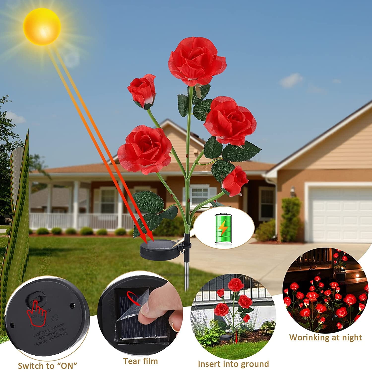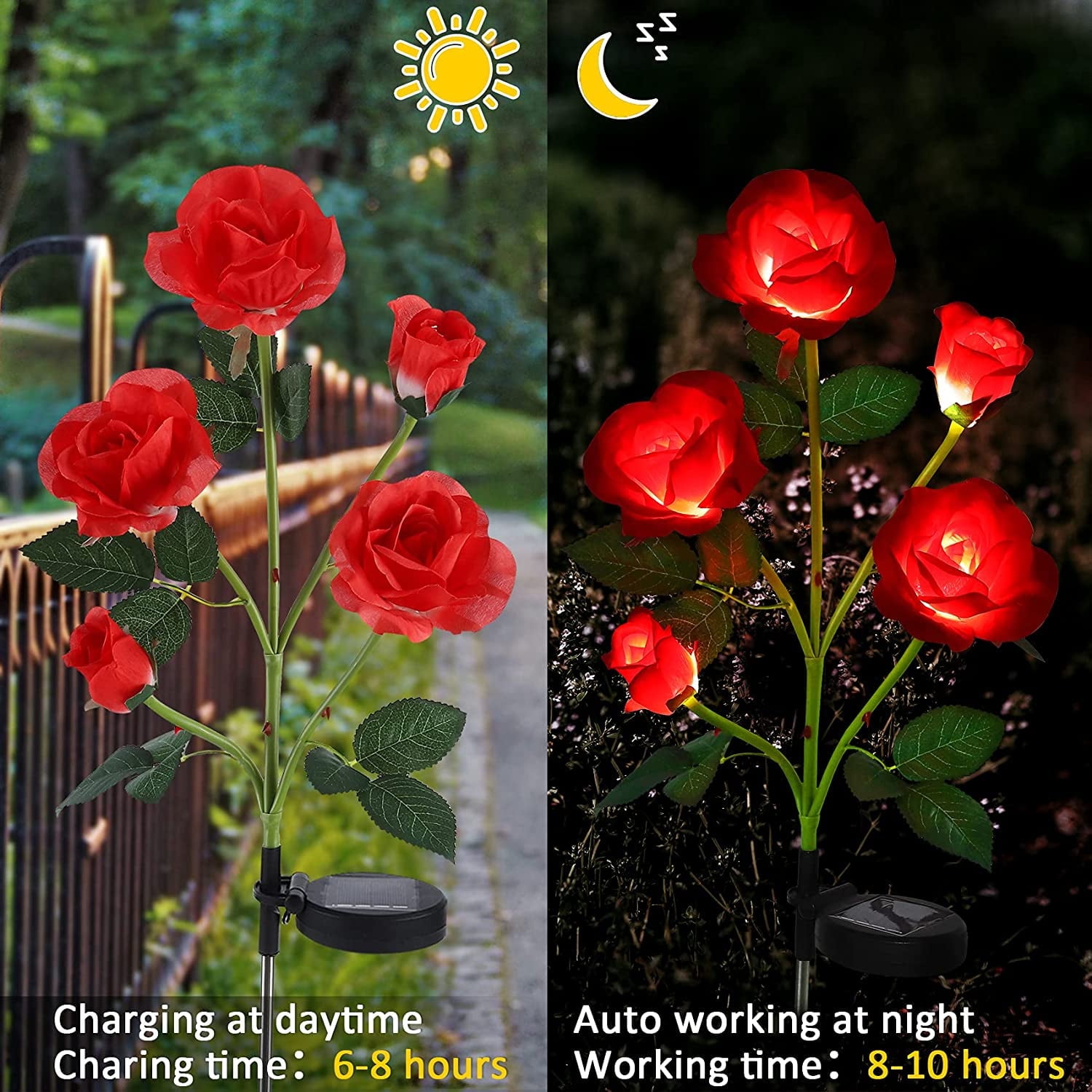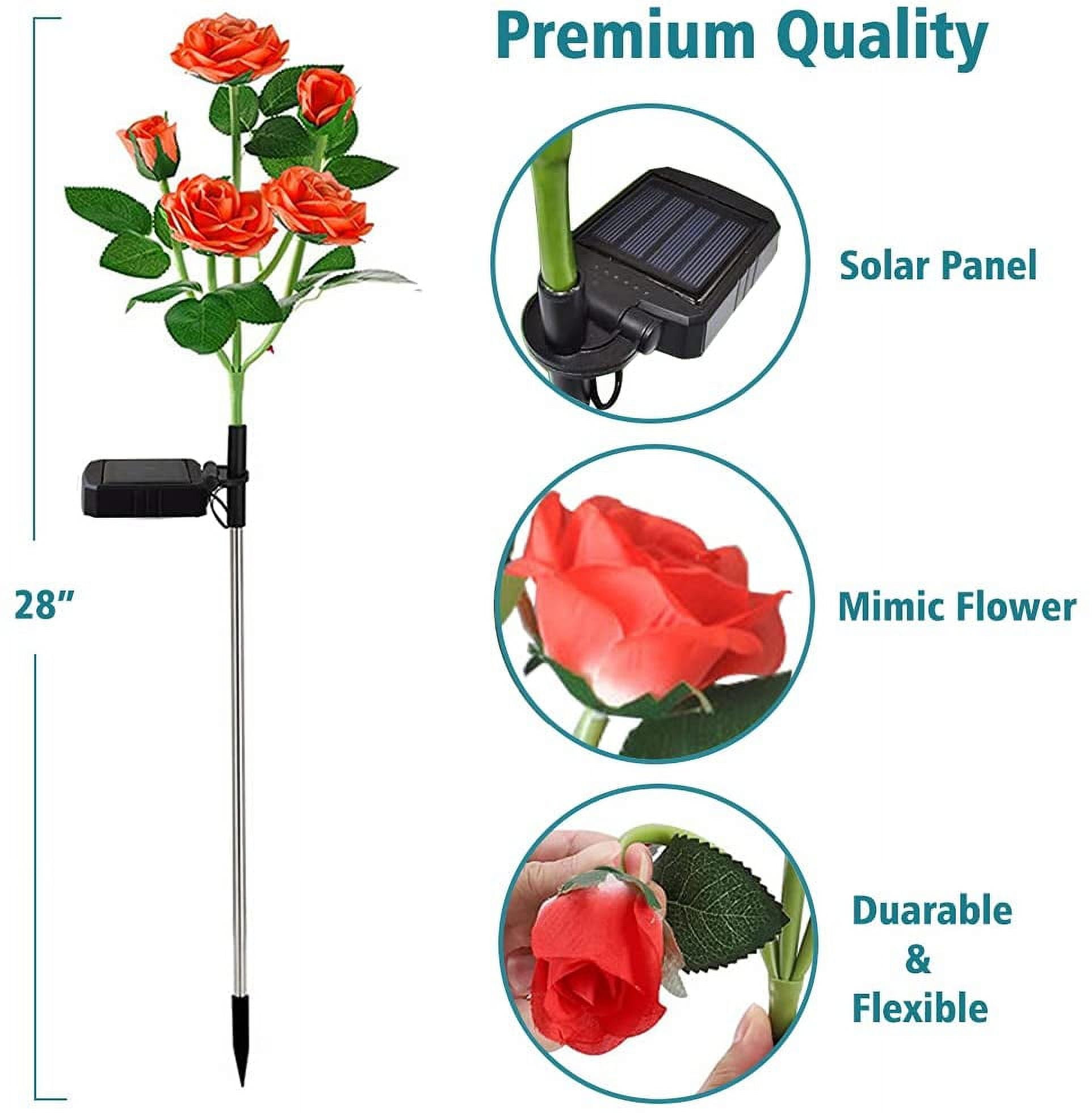 🌹 Realistic Design: Exquisitely crafted rose petals create a lifelike appearance, adding color and beauty to your outdoor garden. ☀️ Solar Powered: Upgraded polycrystal solar panel with built-in rechargeable Ni-MH battery ensures efficient charging and long-lasting performance. 💡 Automatic Dusk-to-Dawn: Lights turn on automatically at night and off during the day for hassle-free operation. 🌧️ Waterproof & Durable: Made of weather-resistant materials with IPX-4 waterproof rating, suitable for rain and outdoor use. ❄️ Works in All Seasons: Reliable performance even in winter, designed to handle temperatures from -10℃ to +50℃. ⚡ Long Runtime: Provides 8-12 hours of continuous illumination after full sunlight charging. 🪴 Easy to Install: No wiring required, simply insert into soil and switch ON for instant decoration. 🎁 Perfect Outdoor Decor: Ideal for gardens, pathways, patios, yards, and walkways, bringing a romantic and elegant glow to your landscape. Specifications Solar Panel: Polycrystal Solar Panel Battery: Rechargeable 1.2V/600mAh Ni-MH AAA (included) Height: 28 in (71cm) Waterproof Class: IPX-4 Runtime: 8-12 hours per charge Working Temperature: -10℃ to +50℃ (14℉ to 122℉) Notice Switch to “ON” mode before use Charge under direct sunlight for at least 8 hours before first use Remove protective film from solar panel Ensure installation in areas with sufficient sunlight