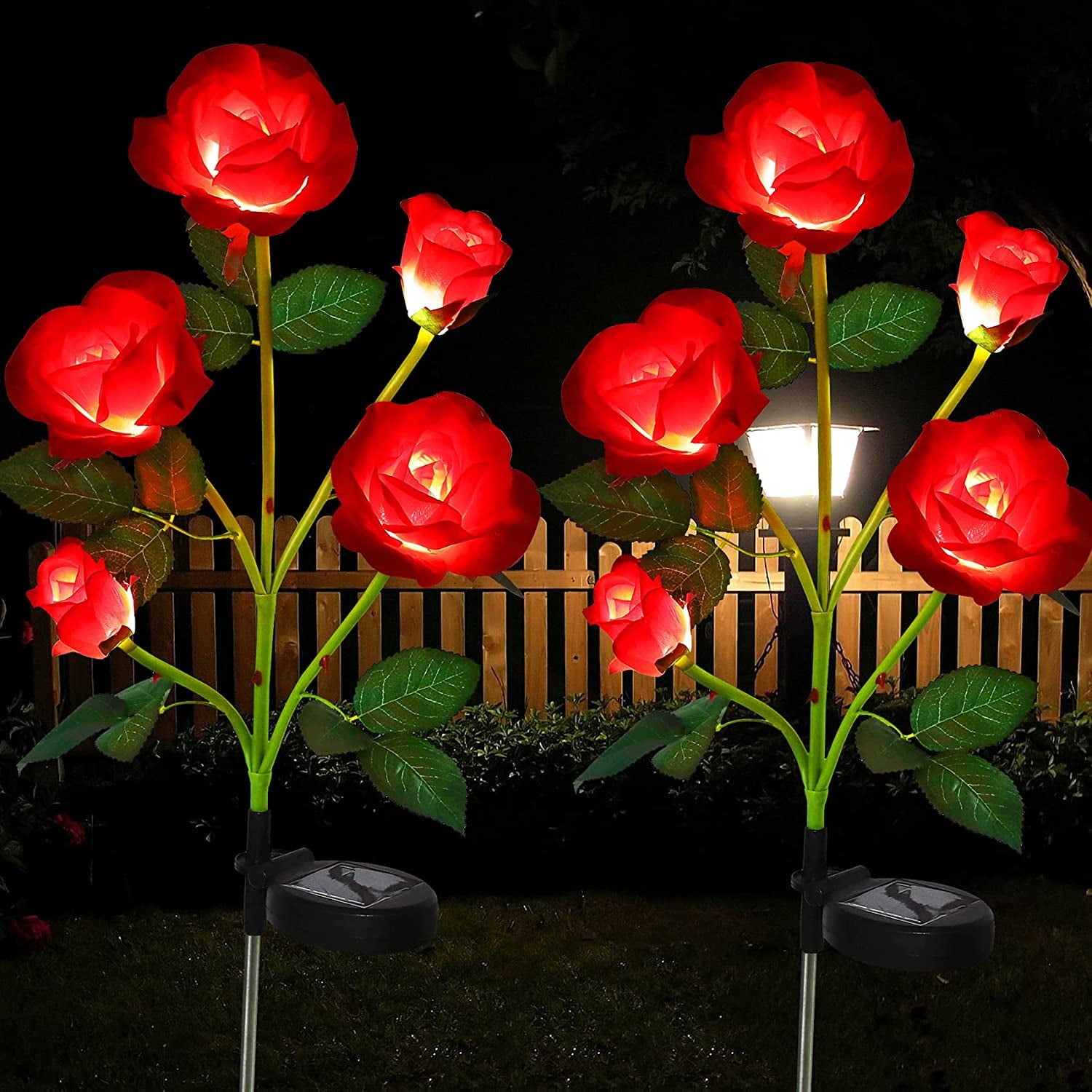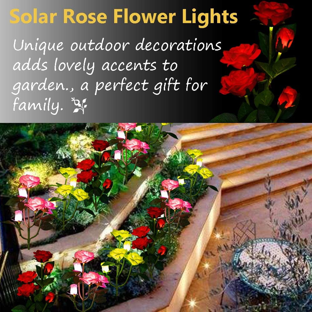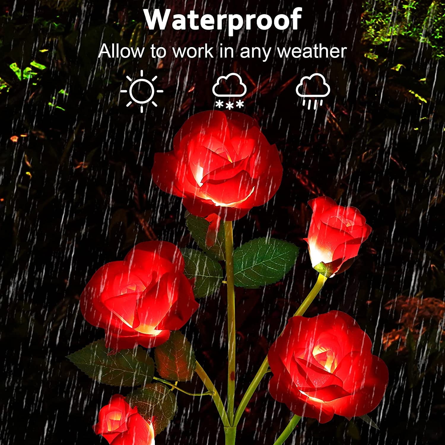 🌹 Realistic Design: Exquisitely crafted rose petals create a lifelike appearance, adding color and beauty to your outdoor garden. ☀️ Solar Powered: Upgraded polycrystal solar panel with built-in rechargeable Ni-MH battery ensures efficient charging and long-lasting performance. 💡 Automatic Dusk-to-Dawn: Lights turn on automatically at night and off during the day for hassle-free operation. 🌧️ Waterproof & Durable: Made of weather-resistant materials with IPX-4 waterproof rating, suitable for rain and outdoor use. ❄️ Works in All Seasons: Reliable performance even in winter, designed to handle temperatures from -10℃ to +50℃. ⚡ Long Runtime: Provides 8-12 hours of continuous illumination after full sunlight charging. 🪴 Easy to Install: No wiring required, simply insert into soil and switch ON for instant decoration. 🎁 Perfect Outdoor Decor: Ideal for gardens, pathways, patios, yards, and walkways, bringing a romantic and elegant glow to your landscape. Specifications Solar Panel: Polycrystal Solar Panel Battery: Rechargeable 1.2V/600mAh Ni-MH AAA (included) Height: 28 in (71cm) Waterproof Class: IPX-4 Runtime: 8-12 hours per charge Working Temperature: -10℃ to +50℃ (14℉ to 122℉) Notice Switch to “ON” mode before use Charge under direct sunlight for at least 8 hours before first use Remove protective film from solar panel Ensure installation in areas with sufficient sunlight