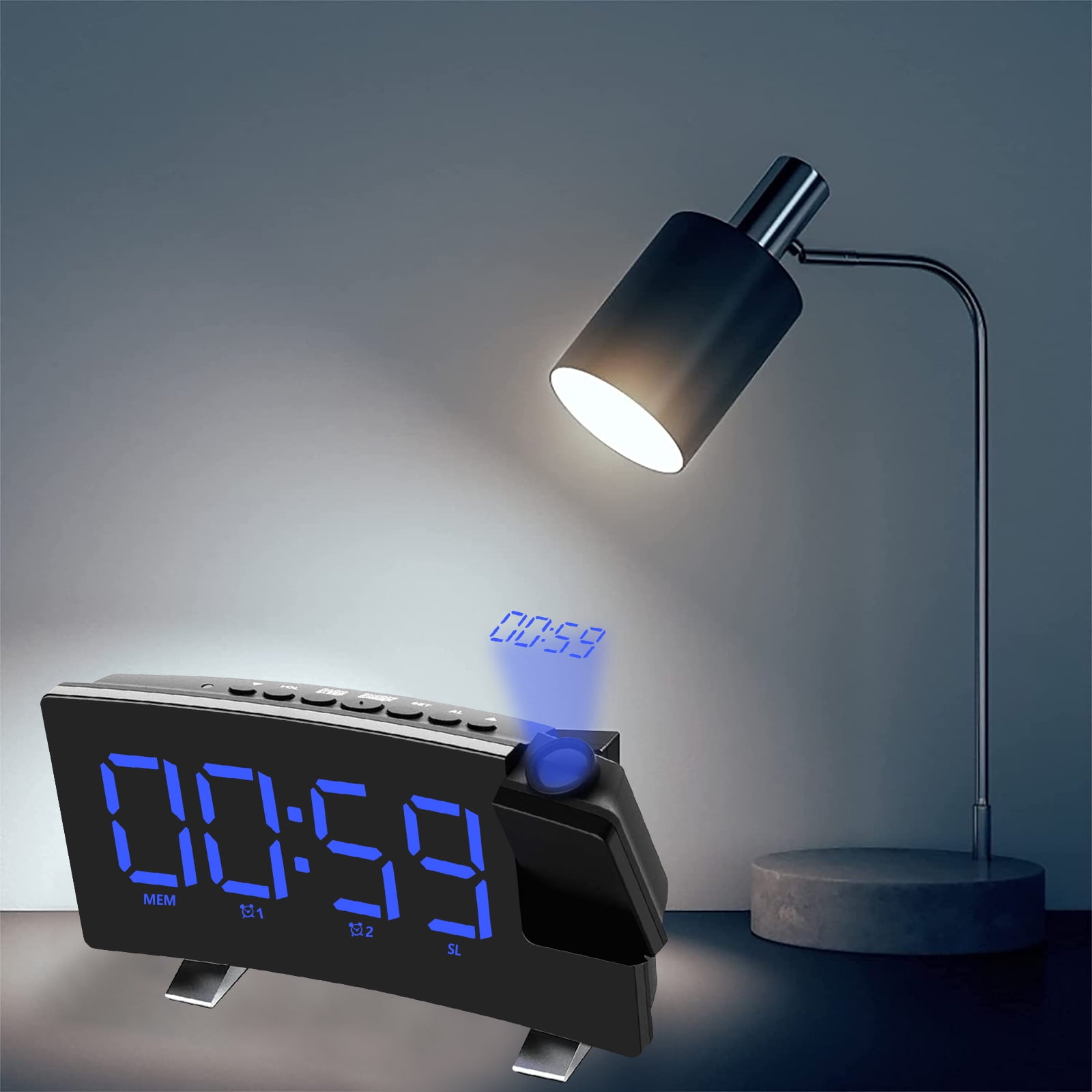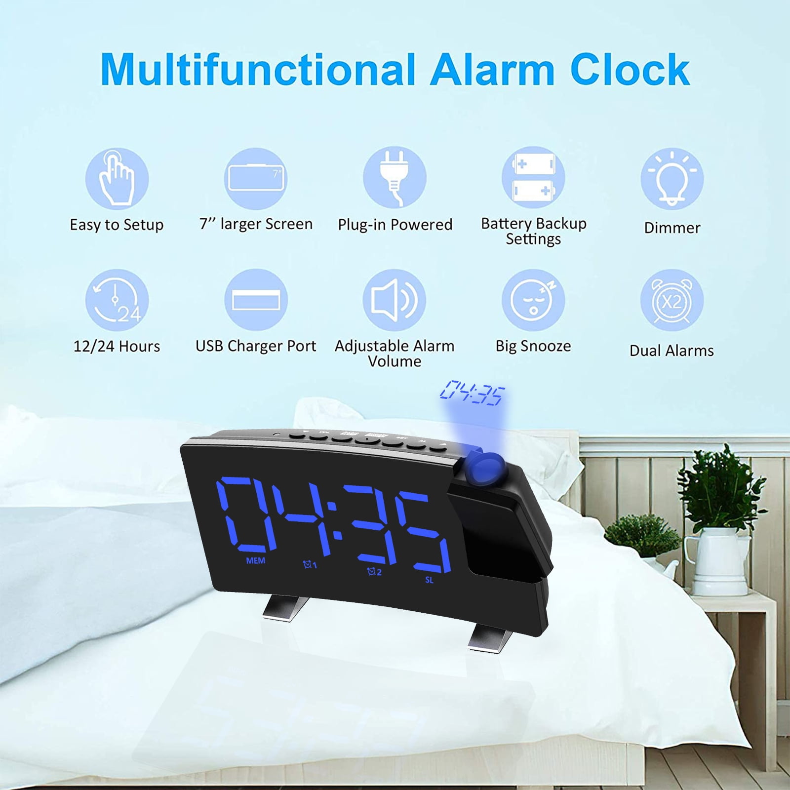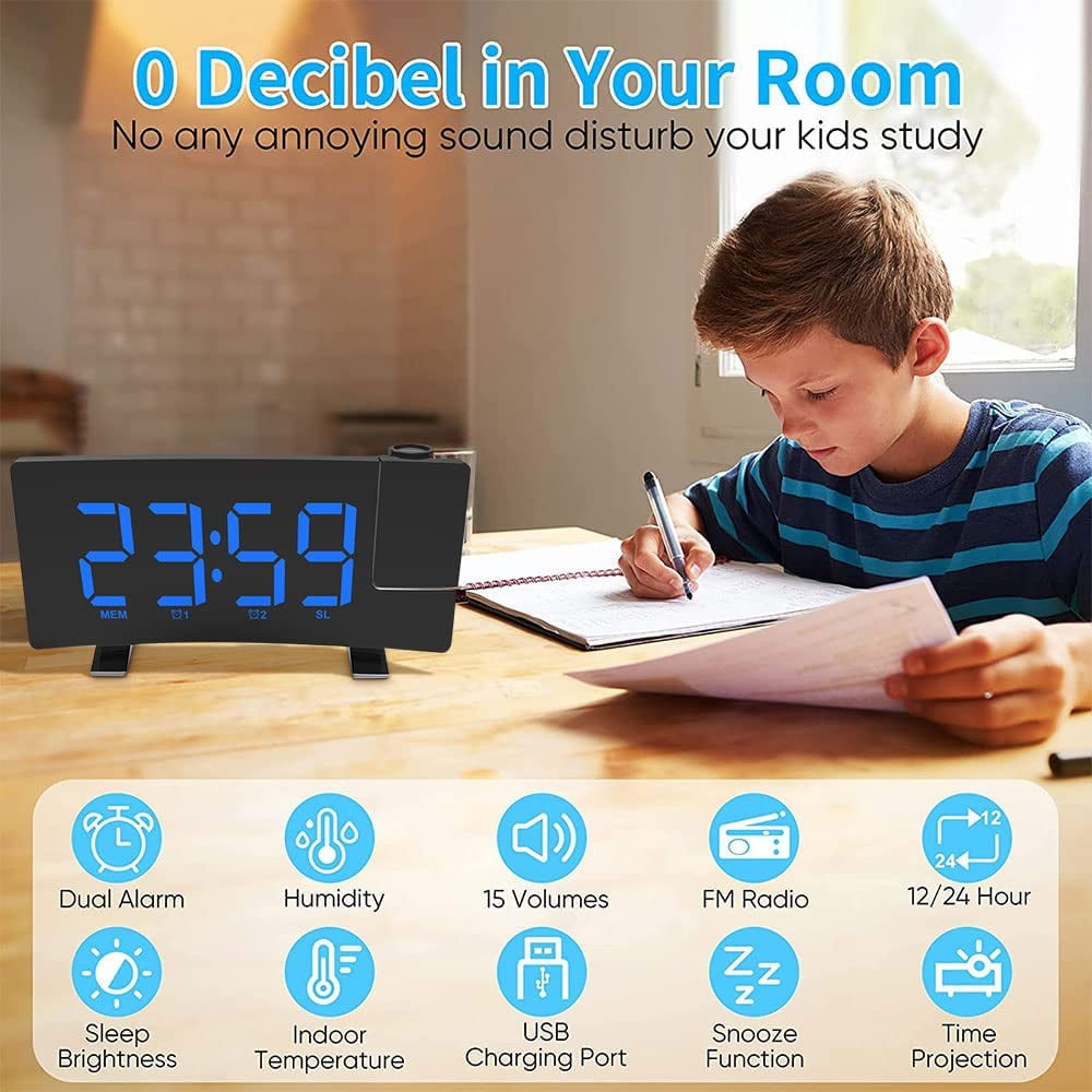 Adjustable Screen:This bedroom digital alarm clock allows you to set the brightness according to your comfort. The curved display is sleek and compact, making it a perfect fit next to the lights on our small bedside table. Power-Off Memory Function:The LED clock radio has a built-in 2032 button battery, which keeps the time in the background after the external power supply is cut off, and does not need to adjust the time repeatedly. Dual Alarm Setting:Our digital alarm clock adopts dual alarm clock setting, you can set two alarm modes of beep and radio. Multifunctional Alarm Clock:Not only a digital alarm clock, but also a digital clock radio, the radio alarm clock can store up to 15 channels. Flexible Projection Alarm Clock:HD 5m projection without manual focus adjustment. The projection display can be rotated 180° for best viewing. You can easily read the time while lying in bed. FM76 ~ 108 frequency band radio, to meet the use of most regions in the world. Using 4 ohms and 3 watts speakers and professional-grade power amplifier circuit design. You can adjust the volume from 0 to 10 levels. 8-inch large screen LED display. Dual alarm clock settings, you can set two alarm modes: beep and radio. 4-level display brightness adjustment and light-sensing stepless dimming. Item Name: Digital Dual Alarm Clock Material: Plastic Color: Black Power Supply: 5V USB DC Shape: Rectangular Display Type: Digital Power Source: Battery Powered Display Type: LED Item Dimensions: 7.09 x 3.58 x 1.81 inches 1 x Projection Digital Alarm Clock 1 x USB Cable 1 x User Manual