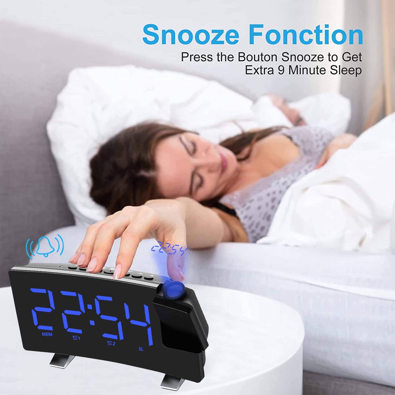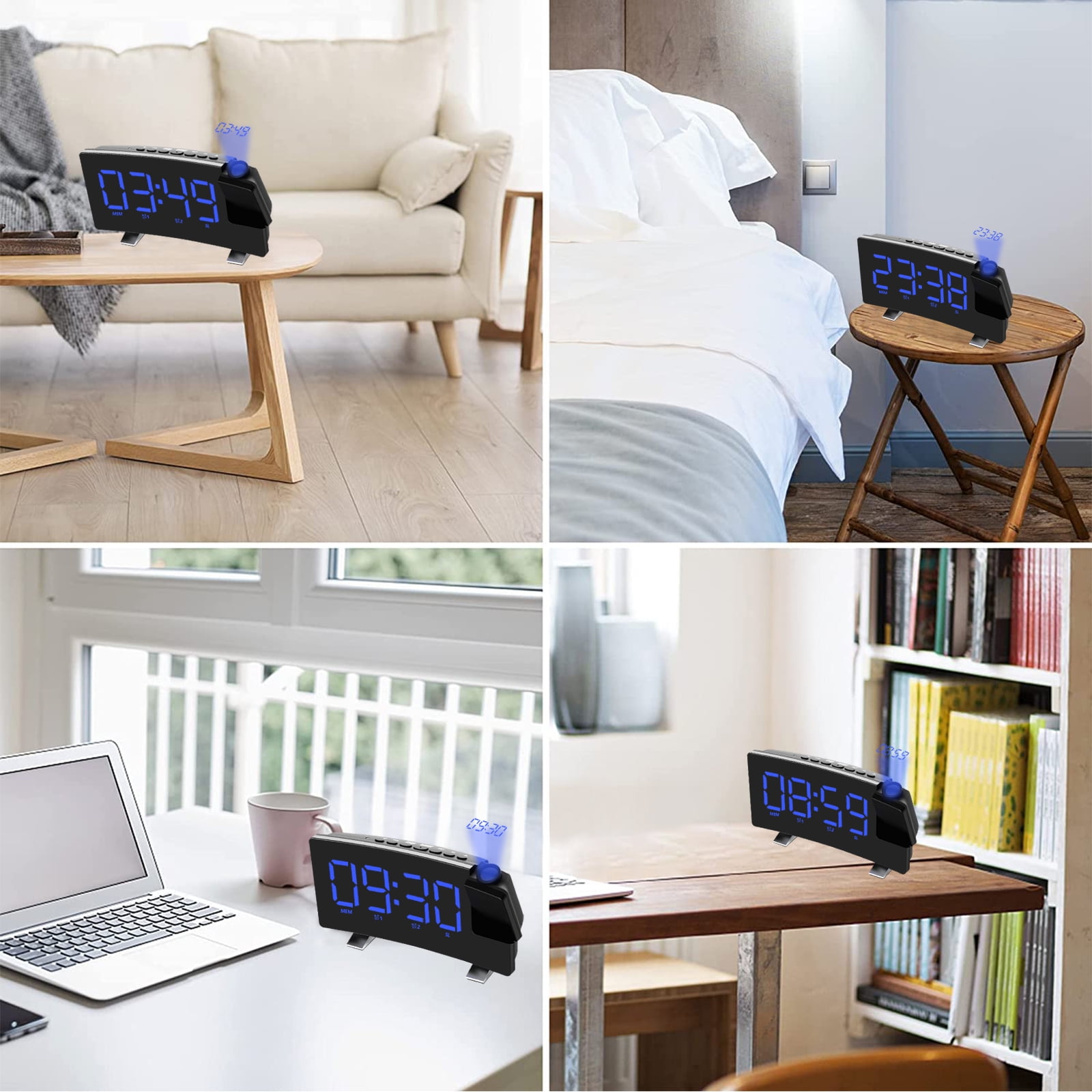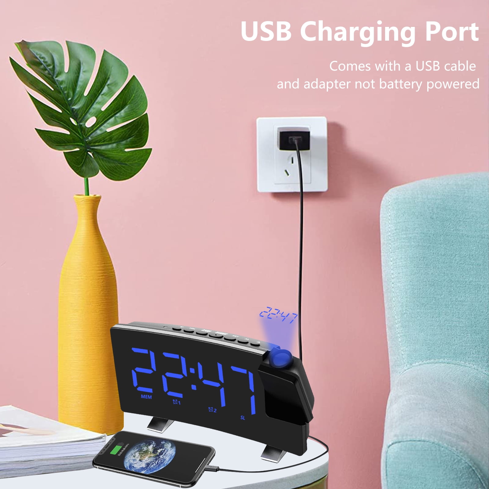 Adjustable Screen:This bedroom digital alarm clock allows you to set the brightness according to your comfort. The curved display is sleek and compact, making it a perfect fit next to the lights on our small bedside table. Power-Off Memory Function:The LED clock radio has a built-in 2032 button battery, which keeps the time in the background after the external power supply is cut off, and does not need to adjust the time repeatedly. Dual Alarm Setting:Our digital alarm clock adopts dual alarm clock setting, you can set two alarm modes of beep and radio. Multifunctional Alarm Clock:Not only a digital alarm clock, but also a digital clock radio, the radio alarm clock can store up to 15 channels. Flexible Projection Alarm Clock:HD 5m projection without manual focus adjustment. The projection display can be rotated 180° for best viewing. You can easily read the time while lying in bed. FM76 ~ 108 frequency band radio, to meet the use of most regions in the world. Using 4 ohms and 3 watts speakers and professional-grade power amplifier circuit design. You can adjust the volume from 0 to 10 levels. 8-inch large screen LED display. Dual alarm clock settings, you can set two alarm modes: beep and radio. 4-level display brightness adjustment and light-sensing stepless dimming. Item Name: Digital Dual Alarm Clock Material: Plastic Color: Black Power Supply: 5V USB DC Shape: Rectangular Display Type: Digital Power Source: Battery Powered Display Type: LED Item Dimensions: 7.09 x 3.58 x 1.81 inches 1 x Projection Digital Alarm Clock 1 x USB Cable 1 x User Manual