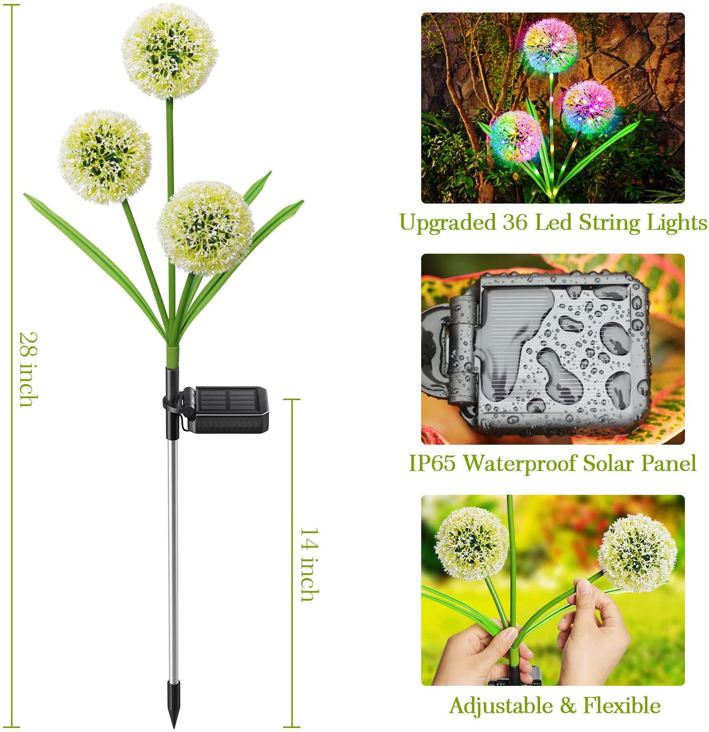 π Solar Powered β High-efficiency monocrystalline silicon panel charges the 600mAh Ni-MH battery using sunlight; no wiring required. π‘ 36 Colorful LED Lights β Provides vibrant, romantic, and decorative illumination for yards, lawns, pathways, weddings, and patios. β±οΈ Auto On/Off Feature β Lights automatically turn on at dusk and off at dawn for hassle-free operation. π Two Lighting Modes β Switch between steady and twinkling light modes to create a warm ambiance. π‘ Durable Construction β Weather-resistant ABS material with stainless steel poles ensures long-lasting outdoor use. πΏ Flexible Dandelion Stems β Adjustable iron wire stems and leaves allow customization of light direction and appearance. π§ Easy Installation β Simply insert stakes into the ground; no additional tools or batteries required. β οΈ Specifications & Notice β Size: 6.6×6.6ft; Charging time: 6β8 hours depending on sunlight; Working time: 8β10 hours; Ensure switch is βONβ; remove protective film from solar panel; do not immerse in water. π Perfect Gift Choice β Ideal for home decoration, parties, weddings, holidays, and as a thoughtful gift for family and friends. π§οΈ Weather Resistant β IP44 splash-proof design allows safe use in rain and outdoor conditions.